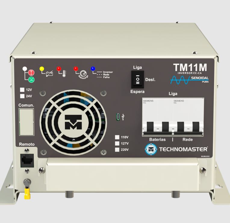 O Inversor de Onda Senoidal Pura TECHNOMASTER é um equipamento destinado a converter corrente contínua (CC), fornecida por acumuladores (baterias), alternadores, placas solares fotovoltaicas, aerogeradores entre outros, em corrente alternada (CA) de 127/220VCA (conforme modelo).